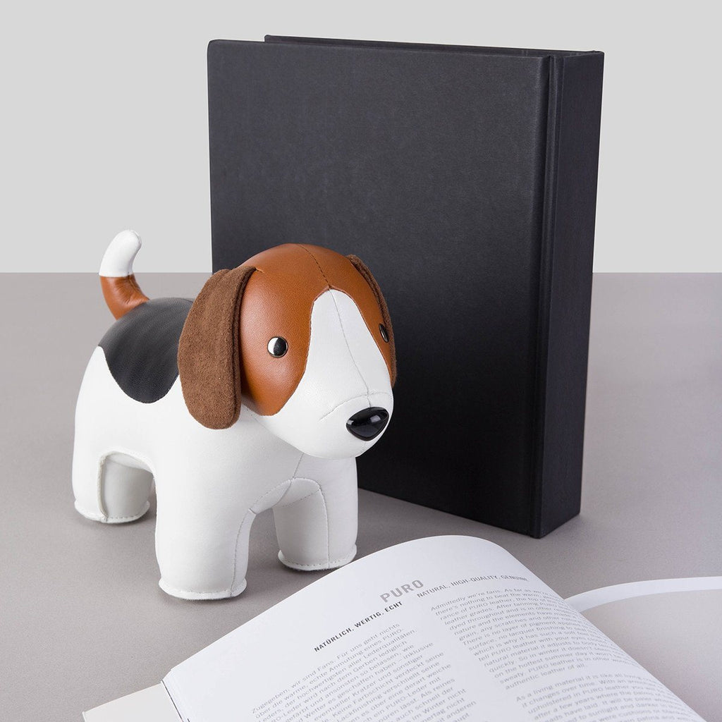 Weighty, minimal & whimsical bookend shaped like a beagle. Tan.