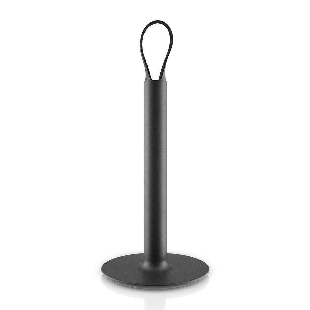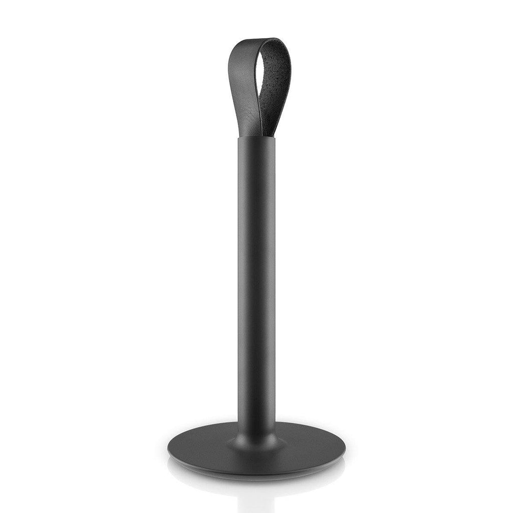 Black coated stainless steel and leather kitchen roll holder with handle for easy moving.