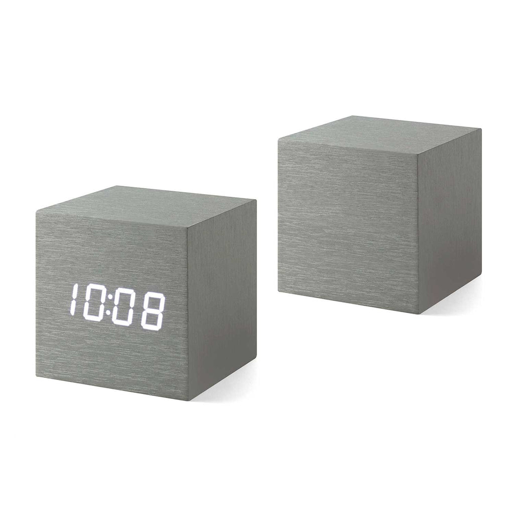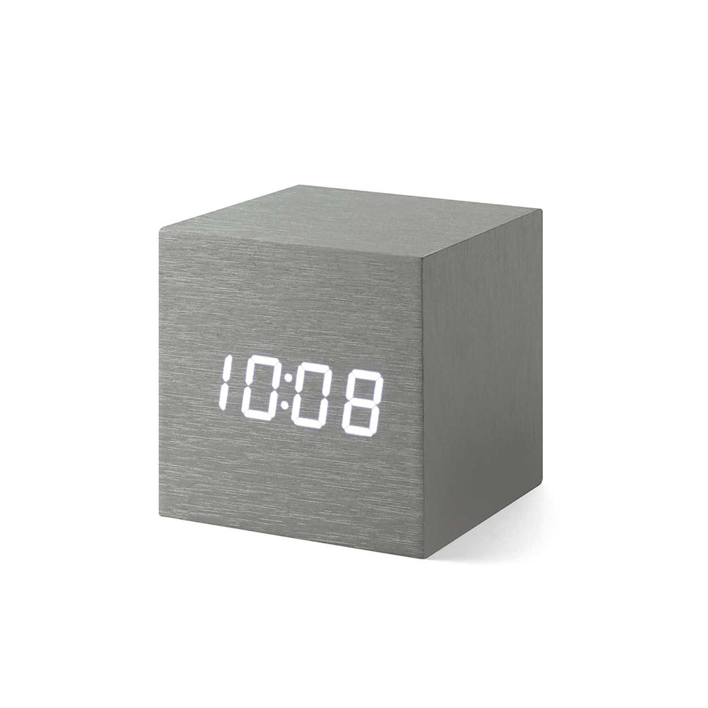 Cube clock with time, date and temperature display and tap-to-turn-on illumination.
