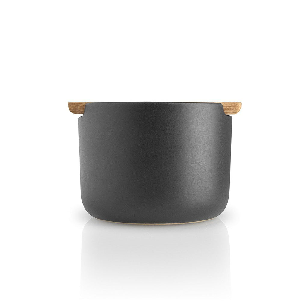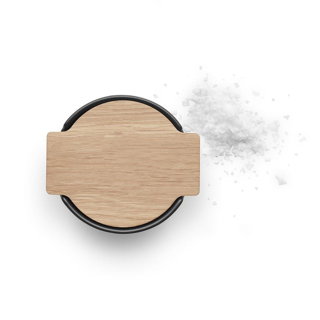 Matt black ceramic salt cellar with oak wood lid.