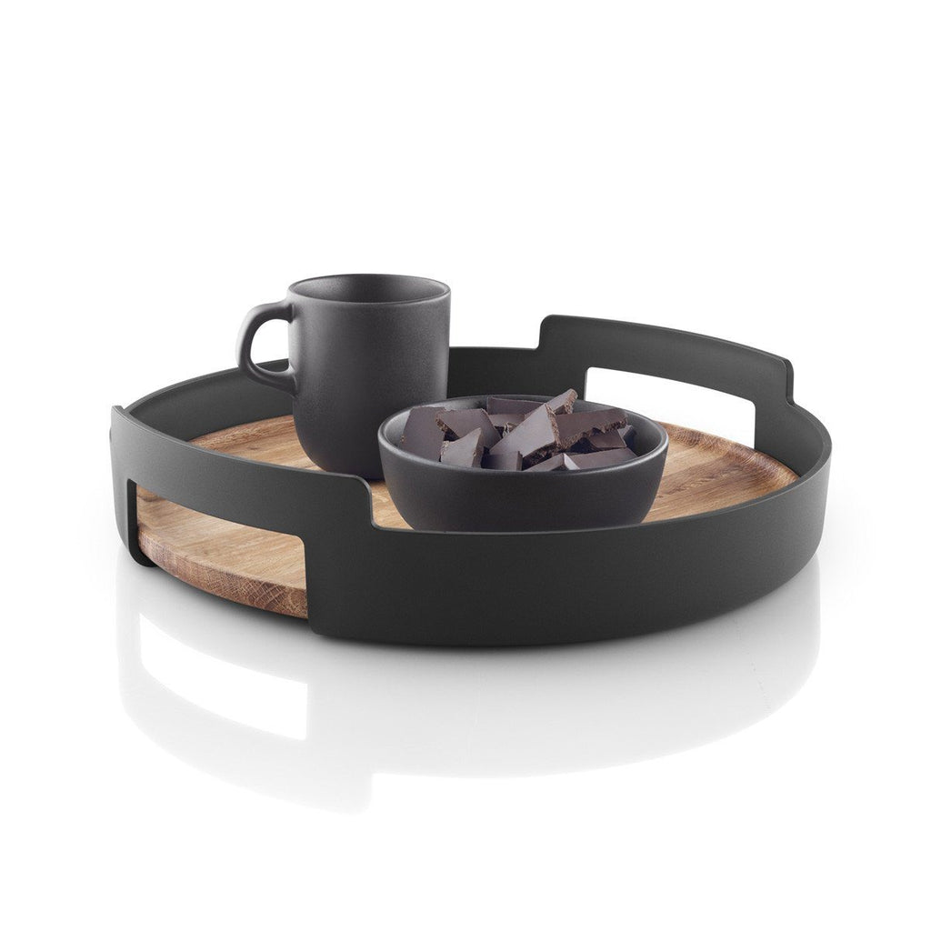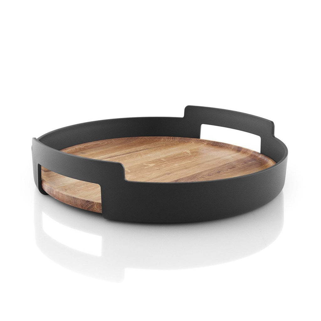 Oak wood round serving tray with black plastic handles.