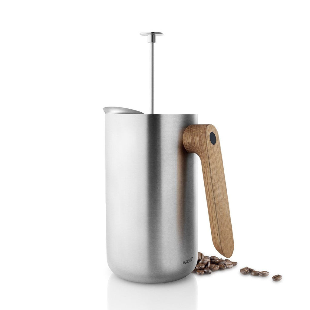 Stainless steel coffee plunger with oak wood handle.