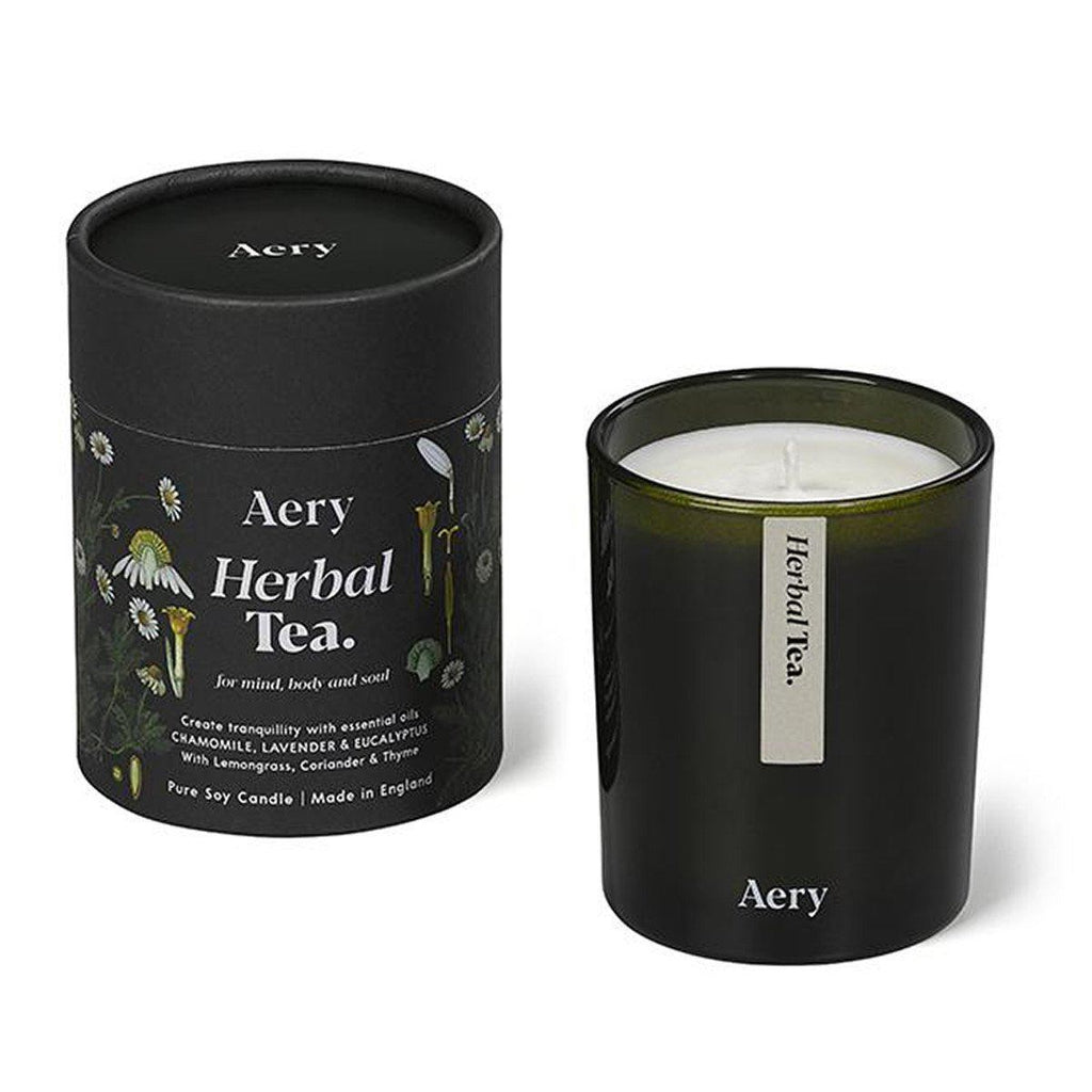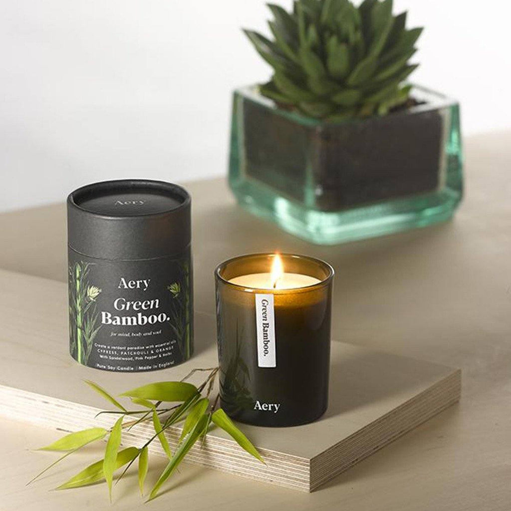 Essential oil soy wax candle in glass vessel. Botanical Green Collection.